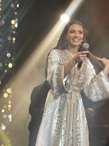 كارمن أطلت أولًا بفستان هادئ وأنيق، لكنها فاجأت الحضور في منتصف الحفل بإطلالة مغربية أصيلة، حيث ارتدت قفطانًا تقليديًا زاد من ارتباطها بالمكان والناس، فبدت وكأنها واحدة من بنات المغرب، تتقن الغناء كما تتقن الحب.