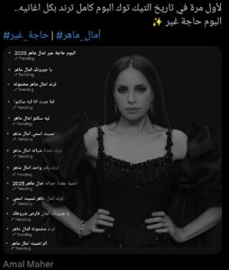 تصدر ألبوم النجمة آمال ماهر الجديد الذى يحمل إسم “حاجة غير” قائمة التريند على منصة “تيك توك”، وذلك بجميع أغانيه، في سابقة هي الأولى من نوعها في تاريخ المنصة، وحقق الألبوم تفاعلاً واسعاً بين المستخدمين، حيث استخدمت مقاطع الأغاني في آلاف الفيديوهات، مما يعكس جماهيرية آمال ماهر الكبيرة ونجاحها في العودة القوية إلى الساحة الفنية.