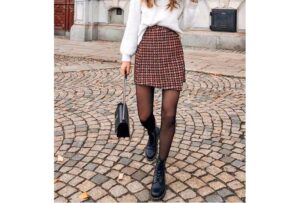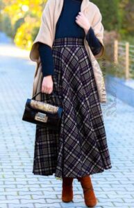 مع بلوزة صوف وحزام: اختاري بلوزة صوف بسيطة ونسّقيها مع الجيب الكاروهات، مع إضافة حزام من الجلد لإضفاء أناقة.