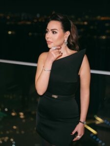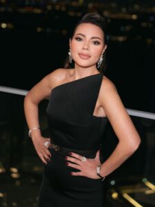 اختارت أسما فستاناً أسود بتصميم أنثوي جذّاب من توقيع David Koma London، أبرز جمالها بأسلوب عصري راقٍ، وأكملت إطلالتها بحزام وحقيبة كلتش من Hermès، وحذاء كلاسيكي راقٍ من Dior.