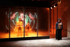 العرض أشبه بفسيفساء من الحكايات التي تُعيد رسم ملامح مدينةٍ فقدت براءتها وجمالها، عبر أداءٍ شعري بصري لثلاثة ممثلين يجسدون أرواح المدينة وشظاياها.