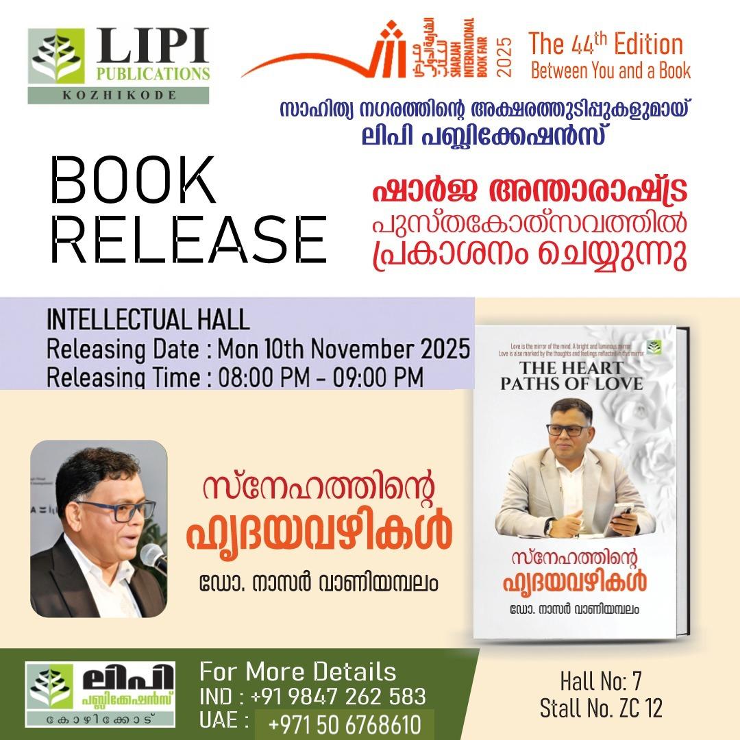 يشهد معرض الشارقة الدولي للكتاب إصدار إطلاق عمل أدبي جديد بعنوان “مسارات الحب القلبية” للدكتور عبد الناصر عبد الكريم ، رسميًا مساء الاثنين في القاعة الفكرية بمعرض الشارقة الدولي للكتاب. سيُقام الحدث من الساعة 8:00 مساءً حتى 9:00 مساءً، ويتضمن مناقشة الكتاب ومشاركة شخصيات ثقافية بارزة ورواد أعمال من الإمارات العربية المتحدة والهند