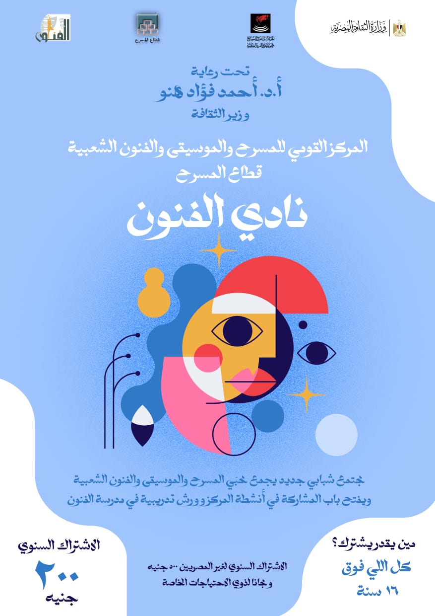 في إطار رؤيته لتوسيع دائرة التفاعل المجتمعي وتعزيز المشاركة الثقافية، ينظم المركز القومي للمسرح والموسيقى والفنون الشعبية حفل إطلاق مشروعه الجديد “نادي الفنون”، وذلك في تمام الساعة الرابعة عصرًا من يوم الاثنين الموافق ٢٤ نوفمبر٢٠٢٥ ، بمقر المركز الكائن في ٩ شارع حسن صبري، الزمالك.