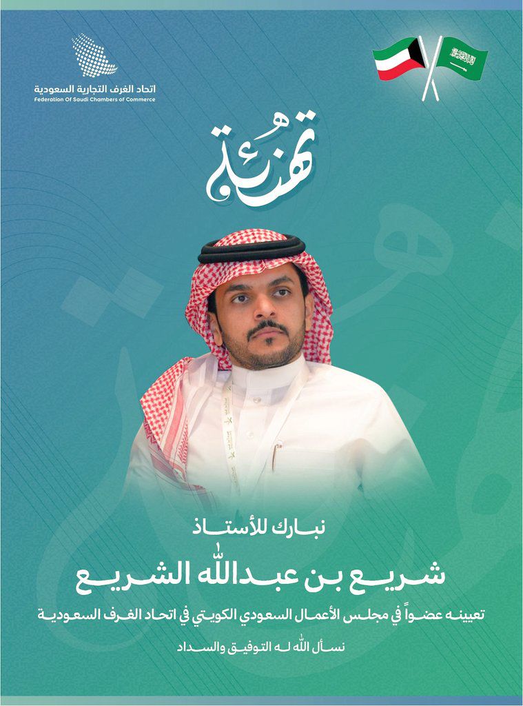 أعلن اتحاد الغرف السعودية عن تعيين الأستاذ شريع بن عبدالله الشريع، الرئيس التنفيذي لـمجموعة الأعمال الوطنية، عضواً في مجلس الأعمال السعودي-الكويتي، وذلك في إطار تعزيز التعاون الاقتصادي والتجاري بين المملكة العربية السعودية ودولة الكويت.