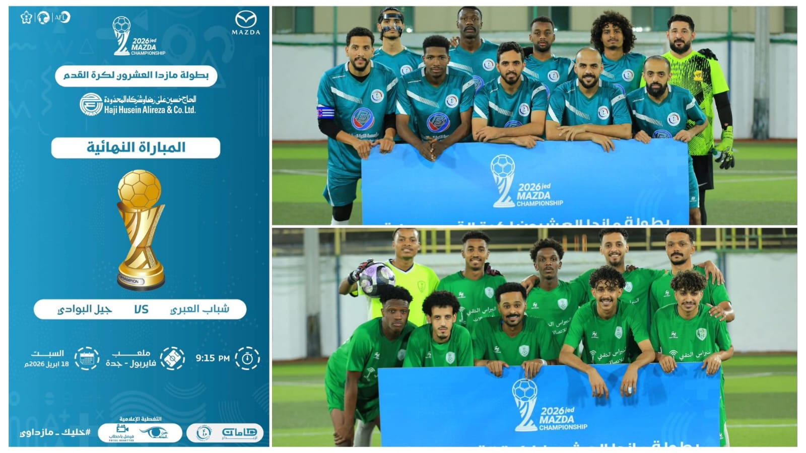 تُختتم مساء اليوم السبت الموافق 18 أبريل 2026 منافسات بطولة مازدا في نسختها العشرين، بمواجهة مرتقبة تجمع بين فريقي شباب العبري وجيل البوادي، وذلك عند الساعة التاسعة والربع مساءً على ملعب فايربول بحي المحمدية في مدينة جدة.