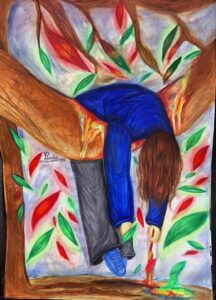 ولا تتوقف تجربتها عند هذا الحد، ففي لوحة “تحت ظل الأوراق”، تطرح رؤية إنسانية مؤثرة، حيث تتجسد حالة من الصراع بين الألم والأمل، من خلال تداخل اللونين الأحمر والأخضر، في تعبير بصري عن جدلية الحياة والفناء، بينما تظل الفرشاة رمزًا دائمًا للطموح والاستمرار.