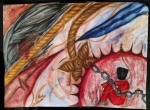 في لوحتها “الرهينة”، يتجسد صراع داخلي حاد، حيث يظهر كيان صغير محاصر داخل فك مفترس، في دلالة قوية على القيود النفسية والأفكار السلبية التي قد تحاصر الإنسان، بينما ترمز السلاسل الذهبية إلى قيود قد تبدو براقة لكنها في الحقيقة أكثر إحكامًا، في حين يظهر عنصر أزرق كرمز للأمل أو التدخل الخارجي لإنقاذ الذات.