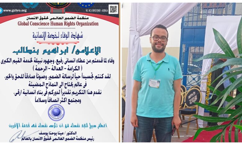 د. مينا يوحنا يمنح الإعلامي إبراهيم بنطالب شهادة “الوفاء لخدمة الإنسانية” من منظمة الضمير العالمي لحقوق الإنسان