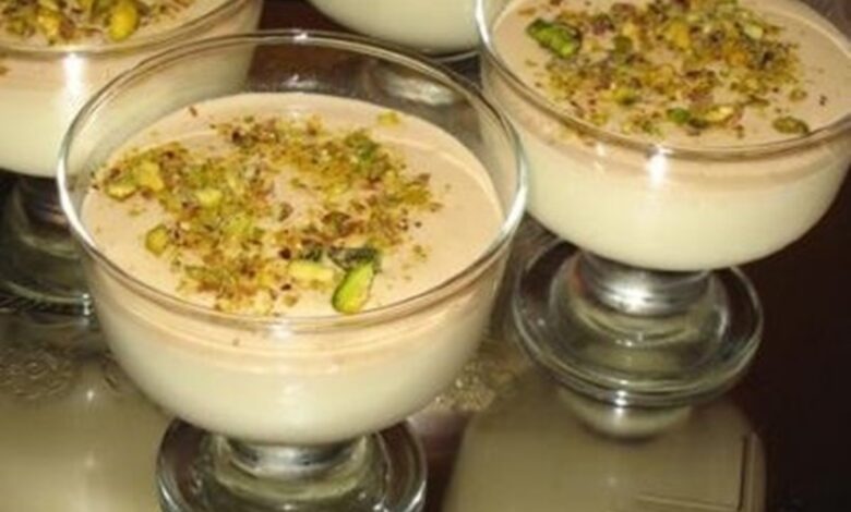 المكونات 250 مل حليب قليل أو خالي الدسم 2 معلقة صغيرة سكر 3 ملاعق صغيرة نشاء ذرة 20 حبة فستق حلبي طريقة التحضير يوضع الحليب في قدر على النار حتى يغلي، ثم يُضاف السكر ويُترك ليذوب، وبعدها يُضاف ماء الورد. يُذاب نشاء الذرة في قليل من الماء البارد، ثم يُضاف إلى الحليب المغلي. يُطهى المزيج لمدة دقيقة مع التحريك المستمر…