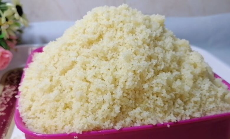 مقادير عمل الكسكى الآتى:- دقيق أبيض ماء ملح سمنة سكر بودر طريقة تحضير كسكسي حلو وحادق: * يضاف الماء تدريجيا حتى يصبح القوام رمليًا. * يوضع في قماشة على البخار مع التقليب حتى تمام الطهي. * تضاف السمنة وتقلب.