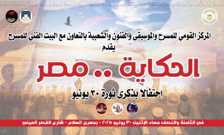 في إطار برنامج وزارة الثقافة للإحتفال بذكرى ثورة ٣٠يونيو، برعاية الدكتور أحمد فؤاد هنو، و بإشراف المخرج خالد جلال، رئيس قطاع شئون الإنتاج الثقافي، ينظم المركز القومي للمسرح والموسيقى والفنون الشعبية برئاسة المخرج عادل حسان بالتعاون مع البيت الفني للمسرح برئاسة الفنان القدير هشام عطوة؛ إحتفالية خاصة بعنوان (الحكاية.. مصر). وتتضمن الاحتفالية عرض حكي غنائي، وذلك في الثامنة…